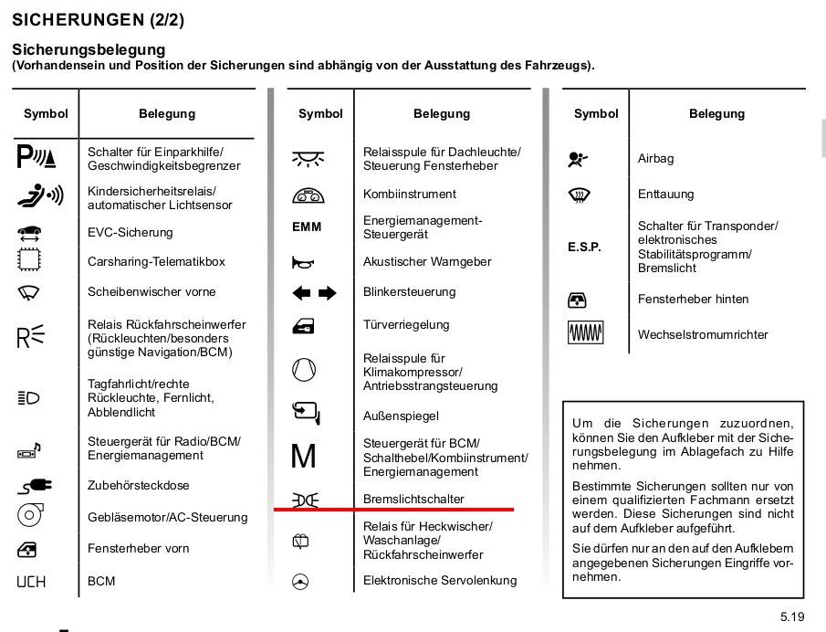 das kann ich mir nicht vorstellen, denn einen Schalter mit einer Sicherung zu versehen macht keinen Sinn, solange dort kein Verbraucher hinter hängt. Ich verstehe die Legende der Sicherungen so das die Bremsleuchten alle auf einer gemeinsamen Sicherung hängen, aber durch die UCH überwacht werden.Die Bremsleuchten haben ja keine eigene Sicherung sondern werden direkt vom Steuermodul gezündet.