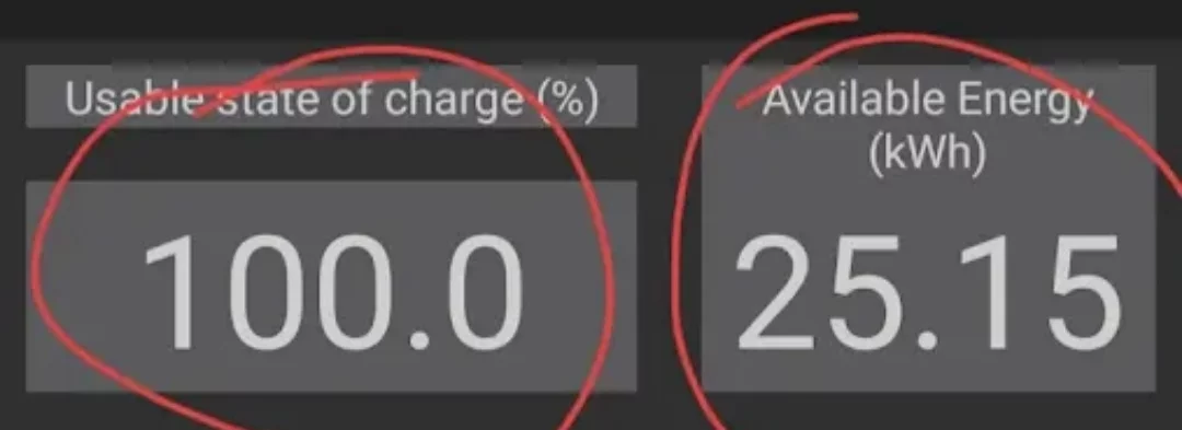 CanZE+ zeigt erwartet bei 100% 25,47 kWh an. Weniger als 1% Unterschied.