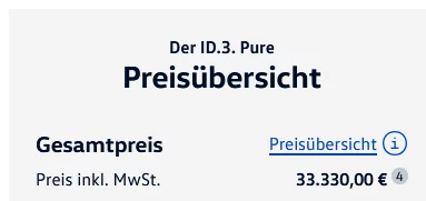 "Mit der Kaufprämie günstiger zu Ihrem ID.: Sichern Sie sich einen attraktiven Preisnachlass von 3.570 € inkl. MwSt. bei Kauf eines ID. Modells der Marke Volkswagen Pkw. Die Kaufprämie wird in der Preisdarstellung auf der volkswagen.de nicht berücksichtigt und mit Bestellung im Kaufvertrag durch den Volkswagen Partner ausgewiesen."