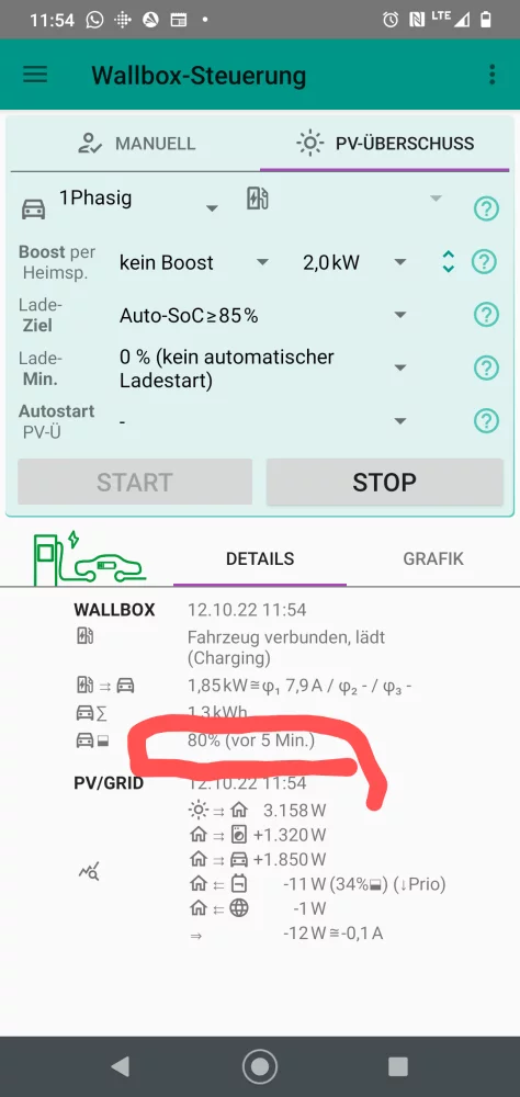 Ich habe dann mal die Begrenzung der Wallbox getestet. Eingestellt auf 10kWh.