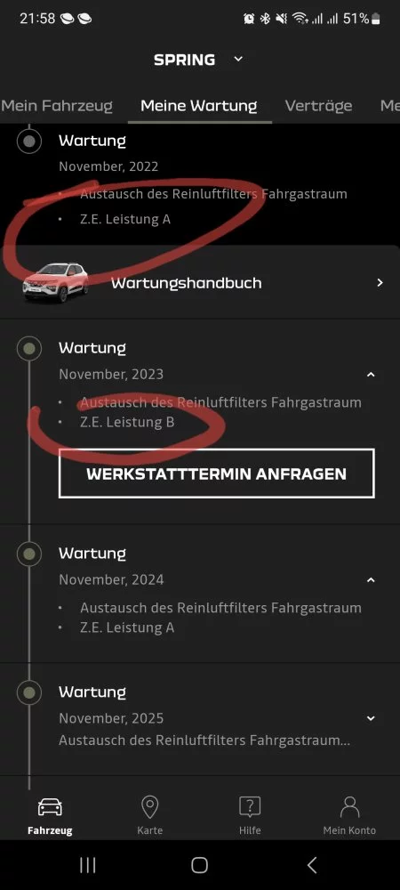 Gemäß diesen Angaben muss der Spring also jedes Jahr einmal zur Durchsicht bzw. Wartung in den Dacia/Renault Fachbetrieb gebracht werden. Dabei wechselt sich immer ein kleiner Service A mit einem größeren Service B ab.