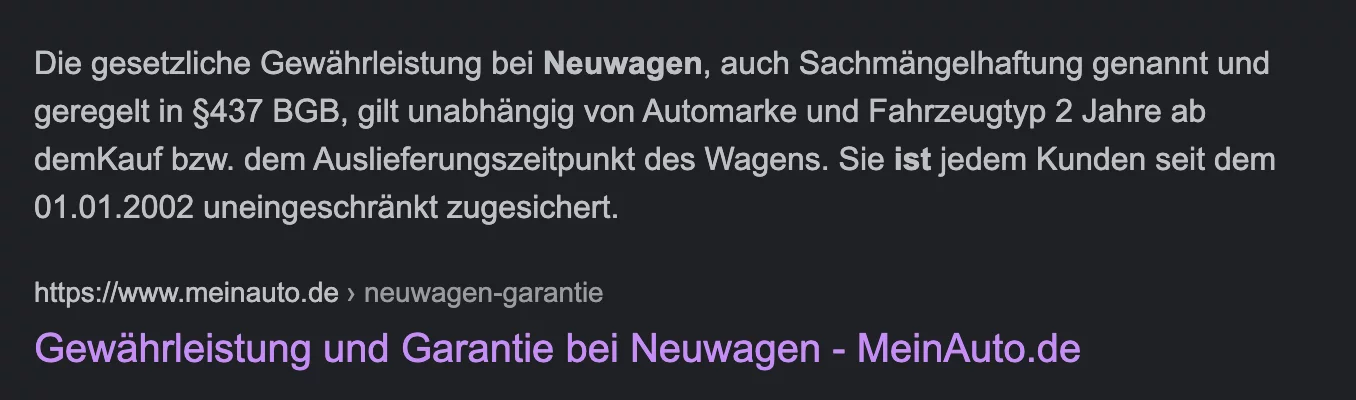 Ich hab ein sehr gutes freundschaftliches Verhältnis zu meinem Renault / Dacia Händler. Daher meine Anmerkung diesbezüglich. Ich habs mir gestern nochmal erklären lassen, es ist in der Tat vorgekommen das bei der Aktivierung des FZG in der App die Garantie auch an diesem Tag begann ( nur in der App!!!! ). Ohne das das FZG schon vor Ort war. Es hat natürlich nichts mit dem gesetzlichen Anspruch zu tun, der is da übergeordnet, is doch klar. Es hatte nur zu Durcheinander geführt. Is auch schon ein paar Monde her, und sicher haben die App Entwickler da was dran gemacht, wie man ja jetzt in einem Beitrag weiter oben sehen kann. Also sind wir uns einig das der Fehler in der App dann wohl behoben ist, alles klar?