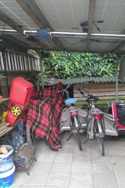 Hier ein Fahrradport mit 6 x 250 Wp aus Zweiter Hand. Pro m² billiger als Wellblech. Ungunstiger Standort (Nordost und mittags im Schatten des Hauses) aber erwarte doch wenigstens 500 kWh/jahr, und trockene Fahrräder :)