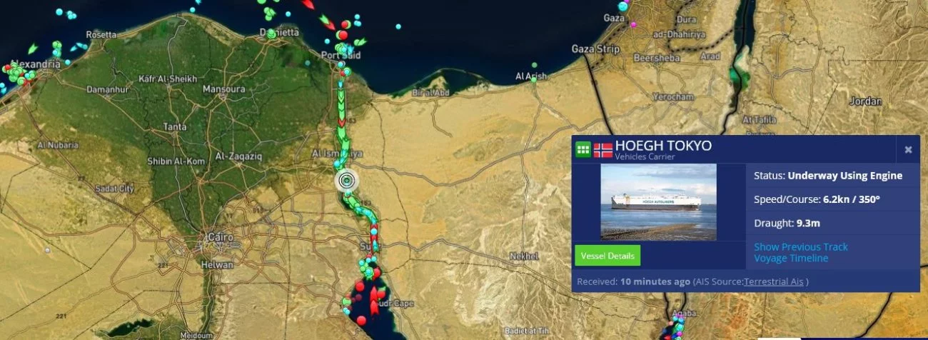 Die Hoegh Tokyo schafft sich mit 6,2 kn durch den Suezkanal, gut die Hälfte ist geschafft. Nächster Anlaufpunkt Piräus, Griechenland 14.7.
