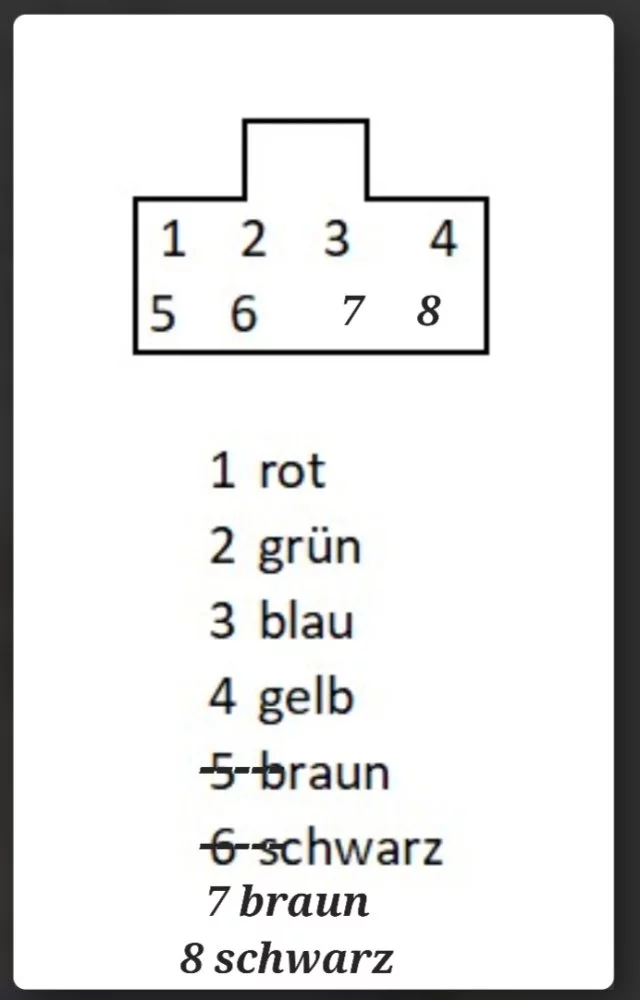 An das Kabel kommt an der Seite zum Radio ein Rasterstecker mit Krimpkontakten, 4 x 2 Abstand der Kontakte 2,54 mm aus der Bucht