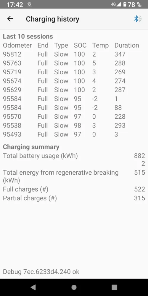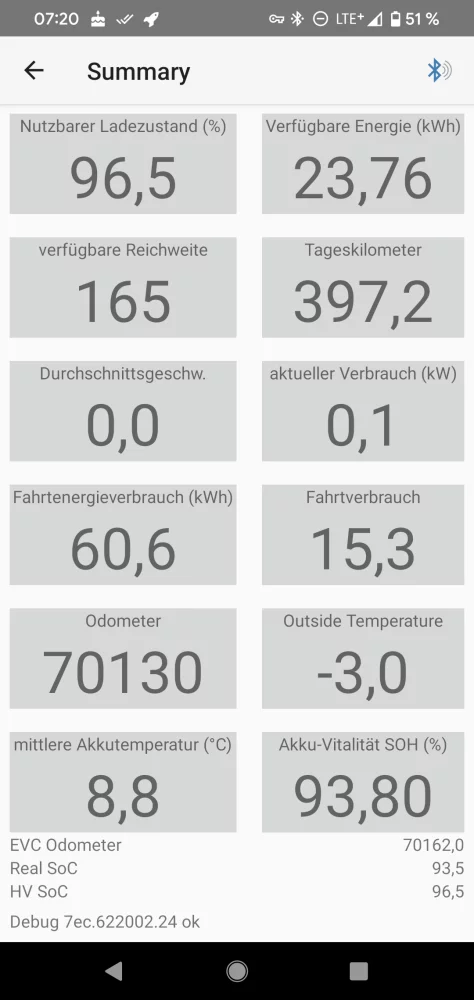 91,71% SoH - davon ausgehend das bei 96,2% SoC -> 23,65 kWh zur verfügung stehen, das bedeutet bei 100% SoC würden 24,58 kwh reinpassen, das sind dann 91,71% SoH ...der Wert dürfte aber nicht korrekt sein weil mit 100% gerechnet, und nicht die 10X% da der Spring ja bekanntlich "über" geladen wird.