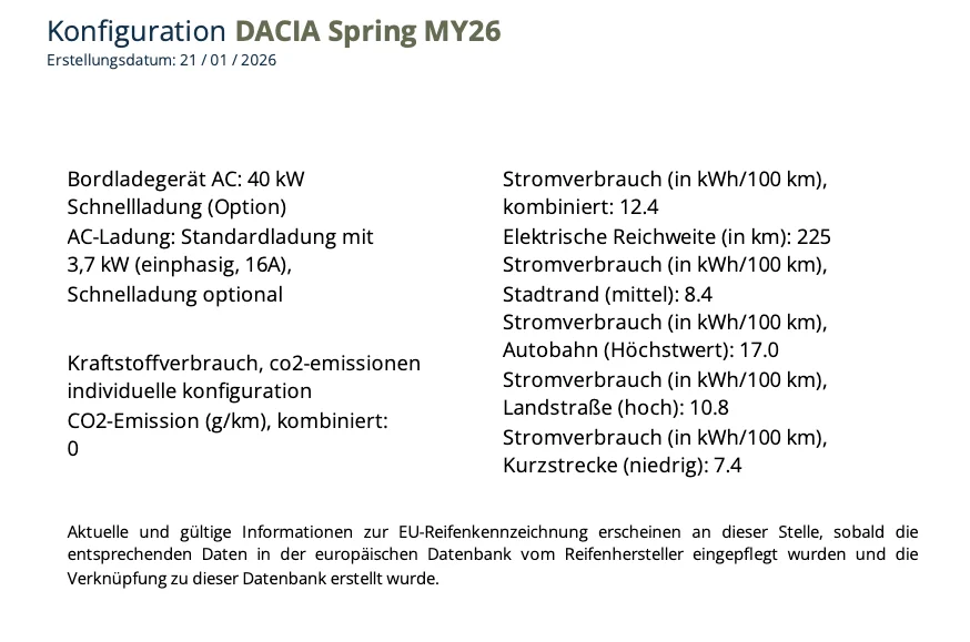 Und da steht eindeutig Dacia 2026, schwarz auf weiß, Boardladegerät: DC 40kW Option, AC-Ladung: Standardladung 3,7kW 16A.