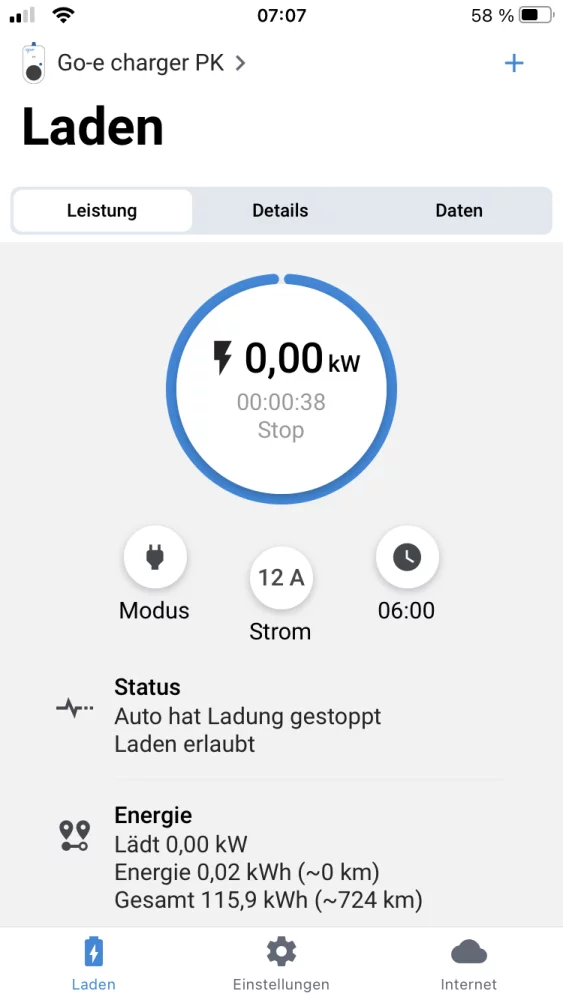 Stimmt, das war mir gar nicht aufgefallen, aber in den Einstellungen hatte ich den gepl. ladevorgang Modus eingestellt. Was jetzt allerdings nicht funktioniert hat, ist nochmal draufladen. Auto steht nach wie vor angestöpselt in der Garage, ( nach dem letzten erfolgreichen Timerversuch) ich hatte dann nochmal versucht wieder den Ladetimer zu stellen und nochmal 5 kwh weiterladen zu lassen. Da tut sich nix mehr.