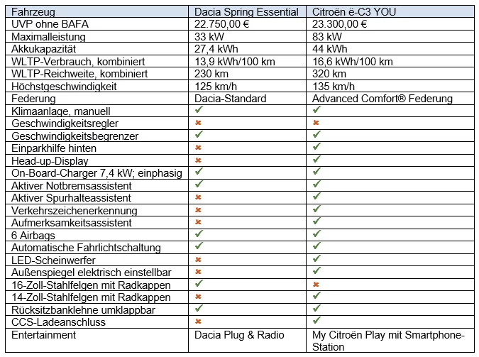 Angenommen der WLTP Wert ist einigermaßen zuverlässig (beinhaltet Ladeverluste), dann ist grundsätzlich der Verbrauch pro Kilometer höher als beim Spring. Allerdings ist das Verhältnis mit dem DACIA Spring Extreme schon deutlich näher beisammen. Und der Extreme zeichnet sich ja "nur" durch mehr Leistung aus. Wer also den extreme wegen des Leistungszuwachs geholt hat: bei Citroen liegen hier 113ps an. Das ist für meine Begriffe wirklich satt. Wir sind mit dem 45ps Spring zufrieden und ich persönlich finde das Verhältnis Akkugröße und Kraft sehr ausgewogen. Wenn der Benziner ausgetauscht werden sollte, wird der nächste Stromer aber mehr Reichweite und ggfs. Anhängelast brauchen (bin gespannt, ob der